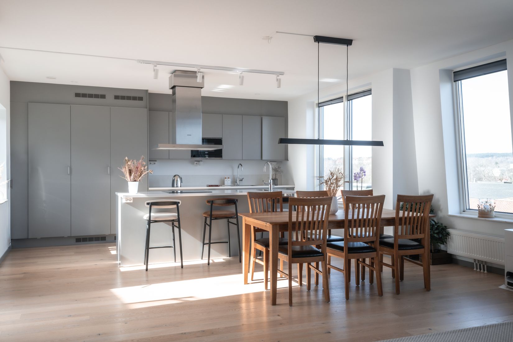 Bostaden präglas av generösa fönsterpartier i flera väderstreck som skapar ett fantastiskt ljusinsläpp och en panoramakänsla genom hela hemmet. Den öppna planlösningen mellan kök och vardagsrum bjuder in till socialt umgänge, med gott om plats för både större middagar och avkoppling. Köket är stilrent och modernt med köksö, integrerade vitvaror och gott om förvaring – en självklar samlingspunkt i hemmet.