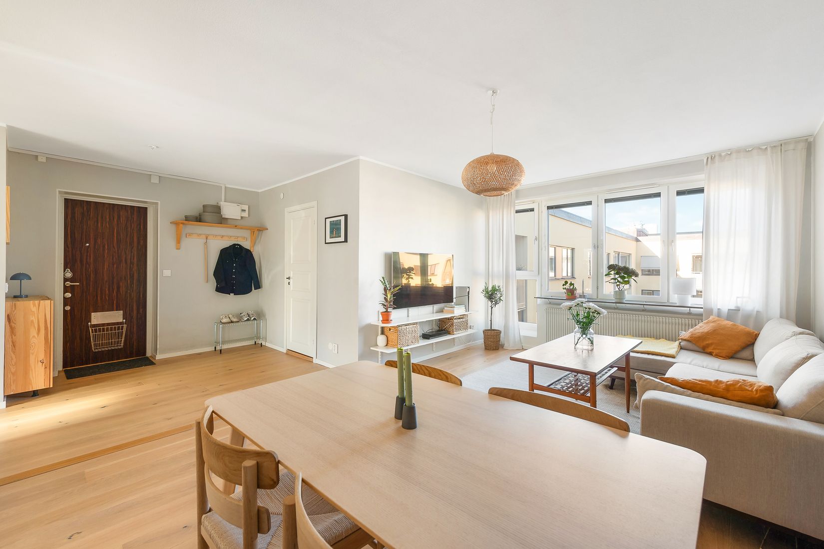 Öppen planlösning mellan kök och vardagsrum skapar sociala ytor med behaglig atmosfär och mycket rymd. Här har ni väl tilltagna fönsterpartier i två separata väderstreck vilket sprider ett flödande ljusinsläpp ända från morgon till kväll i hemmets alla rum. Rymligt och smakfullt renoverat kök i elegant industriell stil, utformat med gråa sidenmatta lådfronter, genomtänkt förvaring samt integrerade vitvaror från kvalitativa varumärken. Exklusivt badrum med behaglig golvvärme, tvättmaskin samt tilltänkta materialval som följer en röd tråd likt övriga bostaden. Denna lägenhet är mycket välplanerad med två utmärka sovrum varav master bedroom med utgång till balkongen samt goda förvaringsmöjligheter i befintlig garderobsvägg.