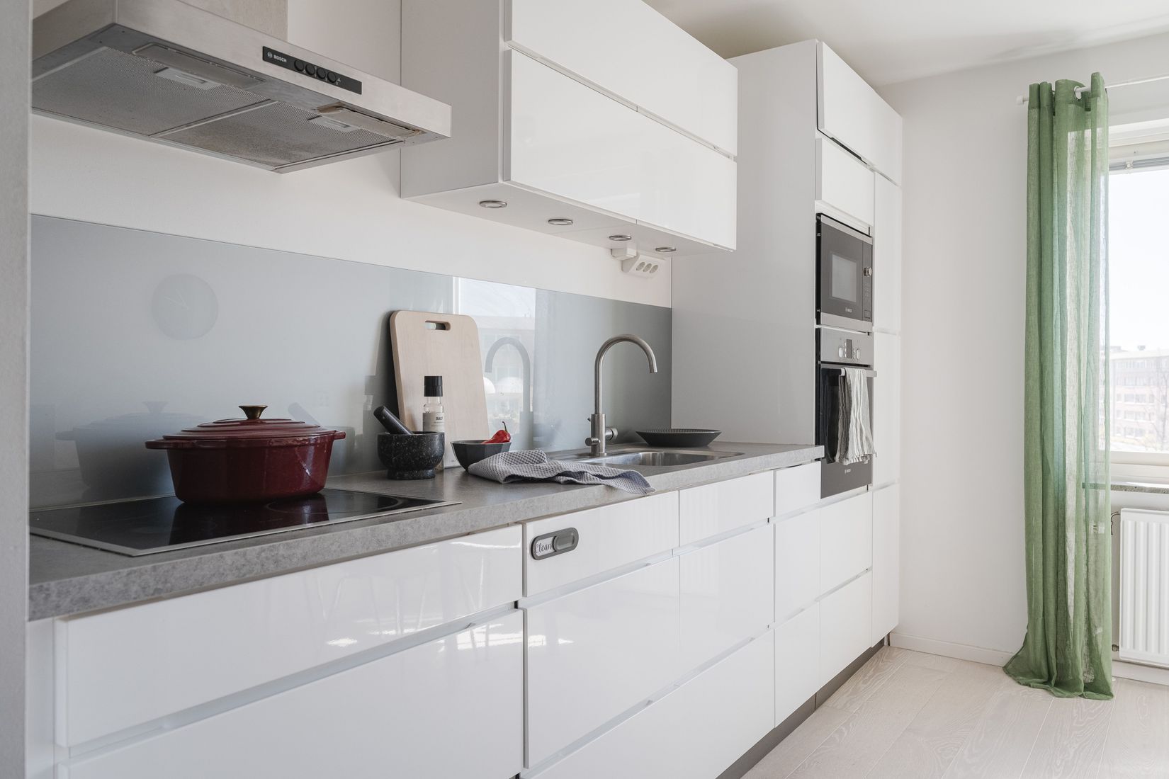 Köket är stilrent och funktionellt med bra arbetsytor och generös förvaring, vilket skapar en trivsam miljö för både vardag och matlagning. Bostaden erbjuder två väl tilltagna sovrum med goda förvaringsmöjligheter, vilket gör den idealisk för såväl familjen som paret eller den som önskar extra utrymme för exempelvis hemmakontor. Det helkaklade badrummet är fräscht och lättskött, och tillsammans med bostadens övriga förvaringslösningar skapas ett smidigt och organiserat boende.