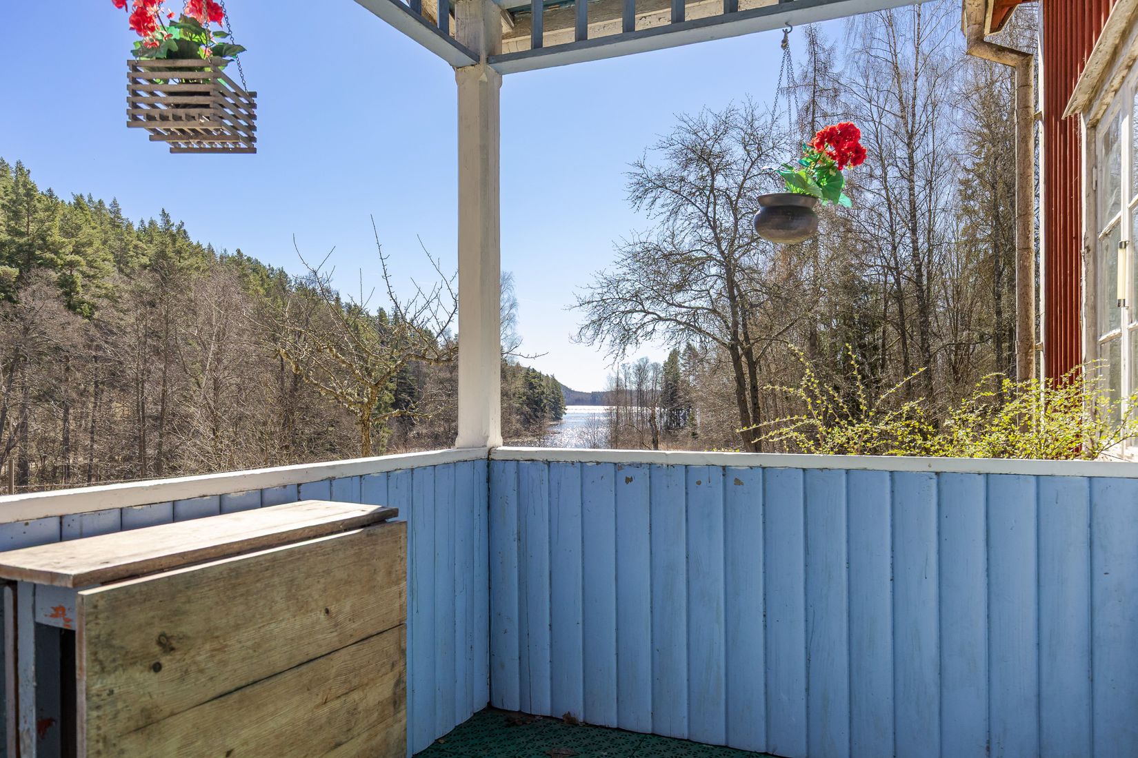 Huset ligger som sagt högt beläget och omges av en generös trädgård med stor gräsyta och vackra gamla växter, buskar och träd. Stort uthus samt gäststuga på tomten. Dessutom finns en större jordkällare. Närmsta livsmedelsaffär hittar man i Österbymo eller för ännu mer handel ligger såväl Kisa som Tranås på kort pendlingsavstånd. Ljuvligt läge med utsikt över Östersjön och endast några kilometer till populär badplatsen vid Campingen i Norra Vi. Morgon- och kvällsdop sker lätt i Östersjön. Drygt tio minuter till Österbymo med mataffär, byggvaruhandel, bibliotek, pizzeria samt systembolag.