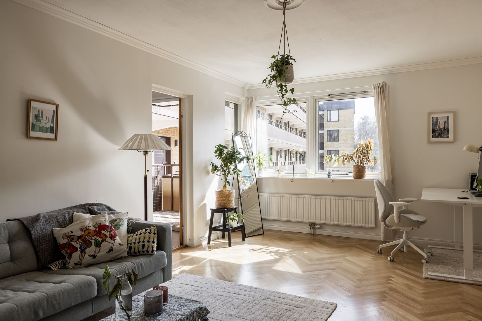 På våning tre väntar ett hem med genomtänkt planlösning och en trivsam helhet där ljuset får ta plats. Entrén öppnar upp i en generös hall med goda avhängningsytor och utmärkta förvaringsmöjligheter i fyra platsbyggda garderober. Härifrån leds man vidare in i bostaden, där en naturlig nisch skapar utrymme för en arbetsplats – perfekt för hemmakontor med plats för både skrivbord och hyllor. Väggarna går i ljusa toner och bryts av med en klassisk Berså-tapet som tillför karaktär, medan parkettgolvet bidrar till ett enhetligt och varmt intryck.
