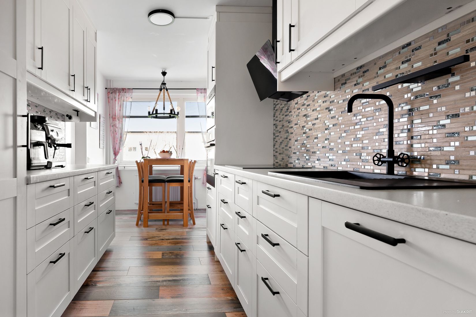 Köket är modernt och smakfullt utformat med plats för matbord, vilket gör det till en naturlig samlingspunkt i hemmet.